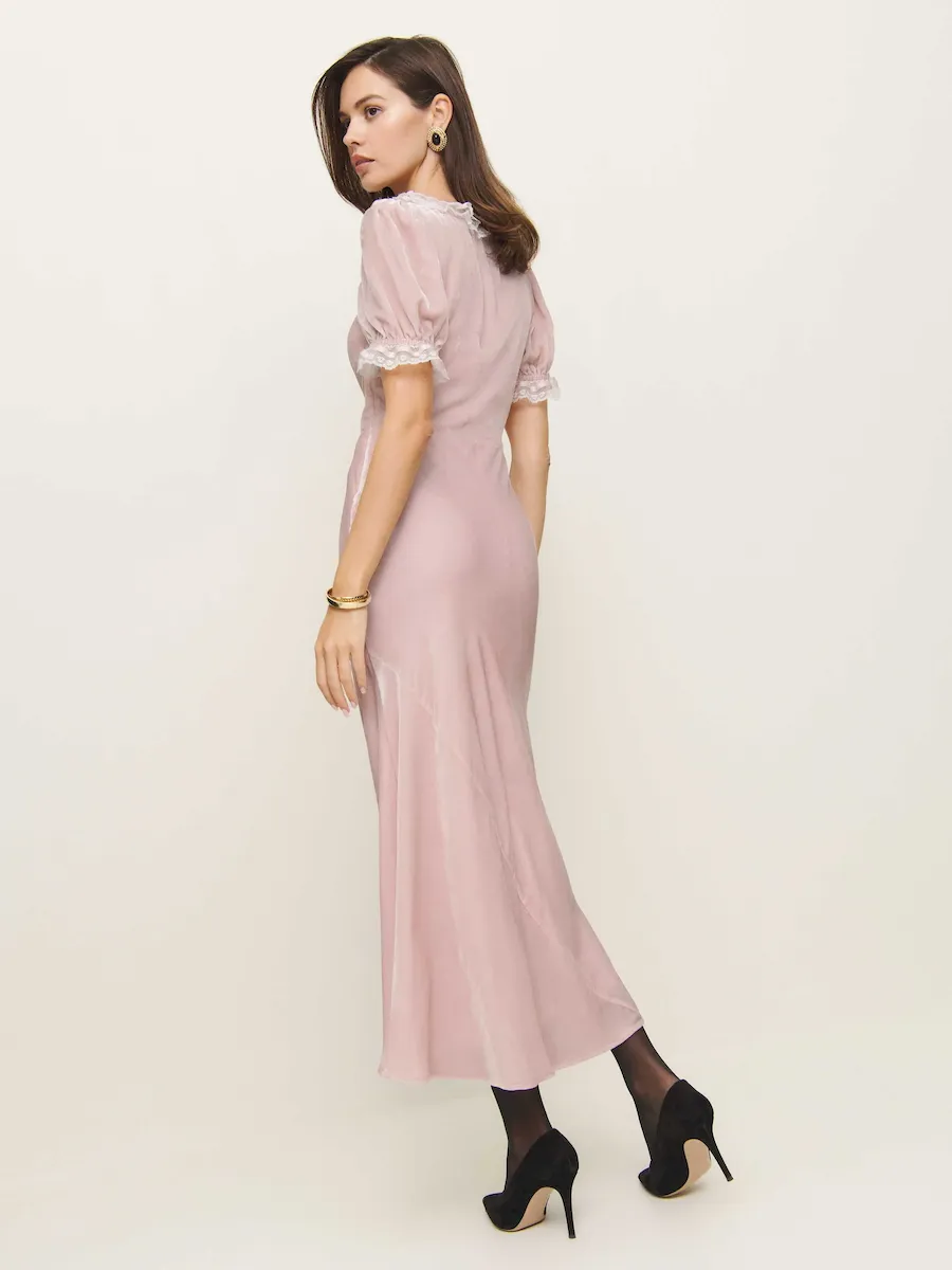 This is a soft, non-stretch velvet with a medium pile – 82% rayon, 18% silk Dry clean only. More onfabric & care.