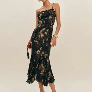 The model is wearing a size 4 and is 5’11”, 26″ waist, 38″ hips, 35″ bust.