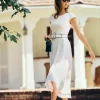 The model is wearing a size 14 and is 5’8″, 33″ waist, 50″ hips, 42″ bust.