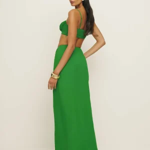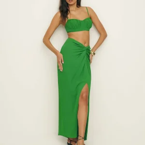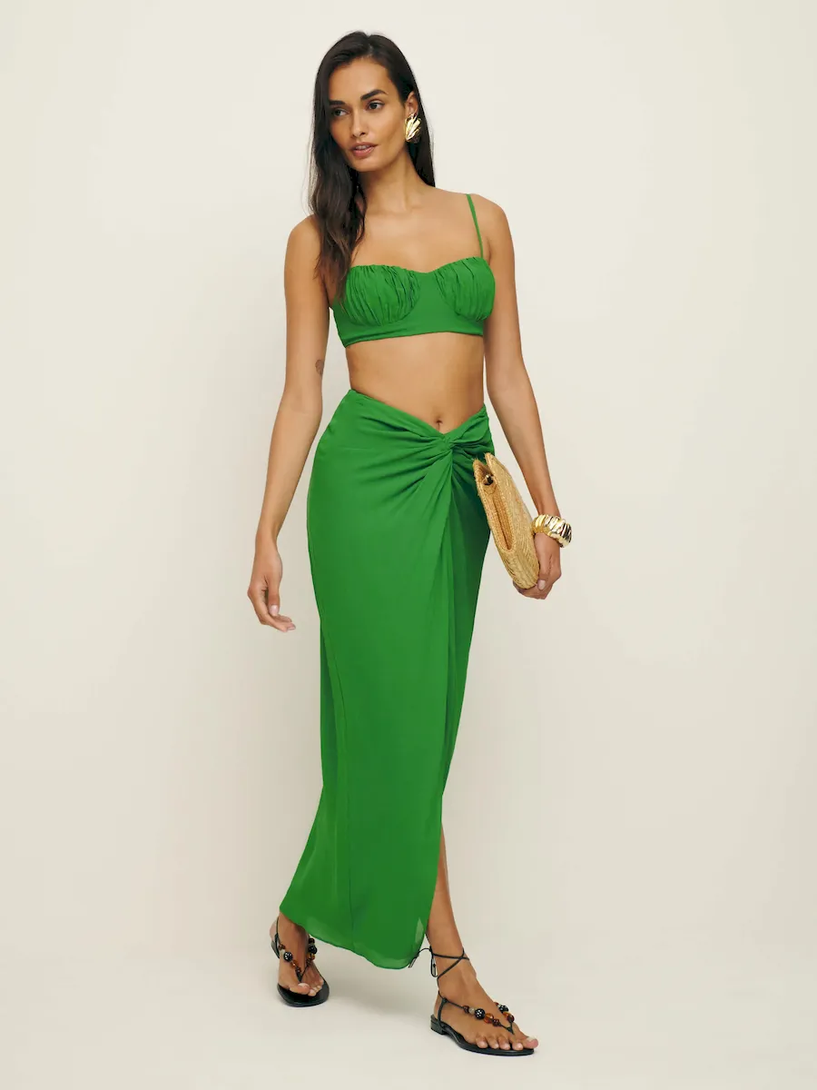 The model is wearing a size 0 and is 5’9″, 25″ waist, 35″ hips, 32″ bust.