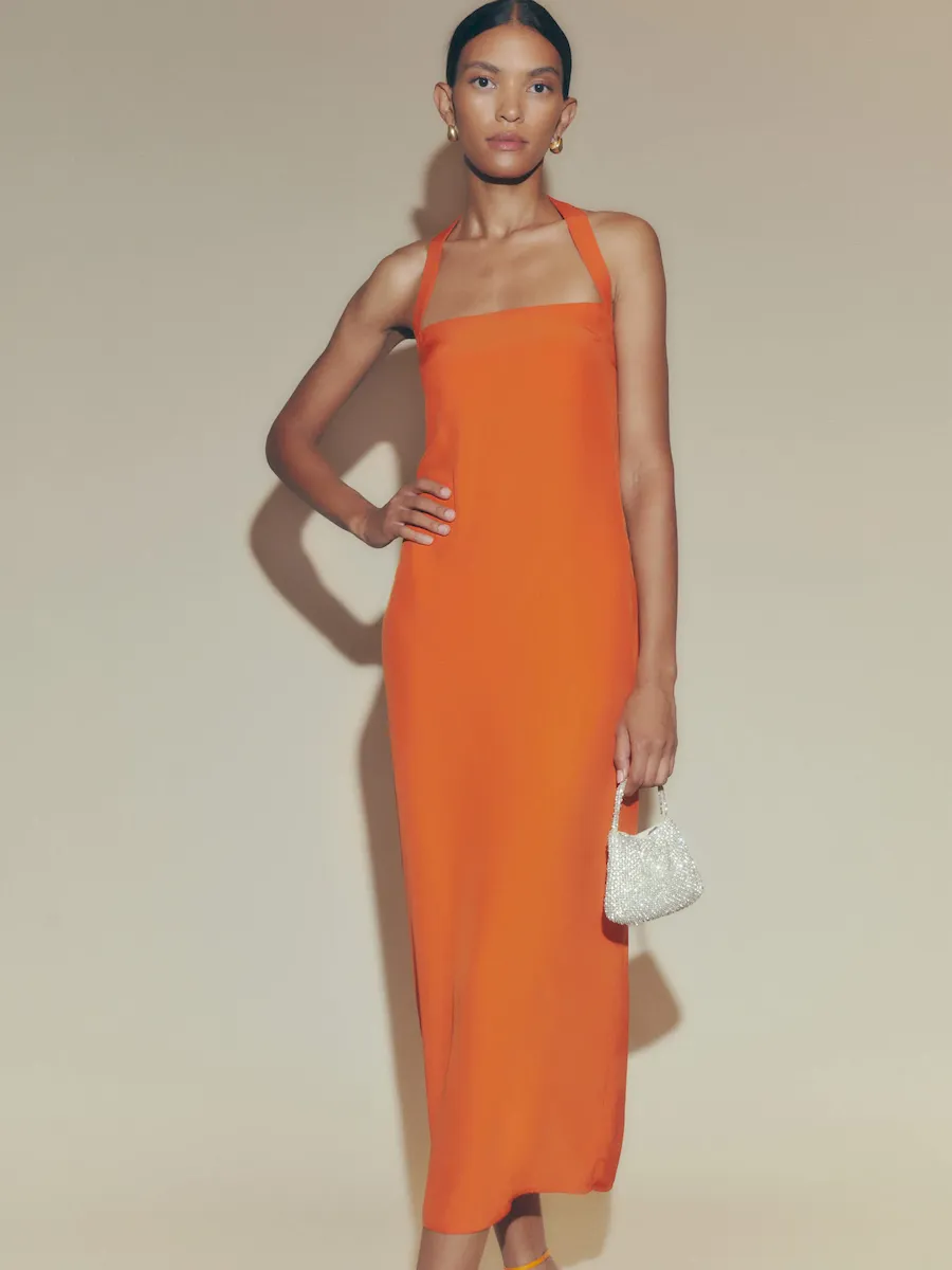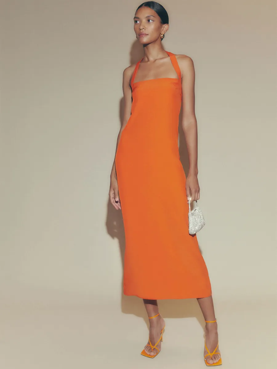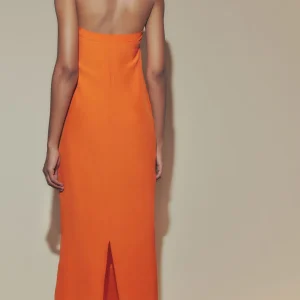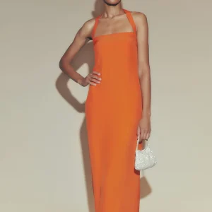 The model is wearing a size 0 and is 5’11”, 24″ waist, 34″ hips, 32″ bust.