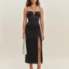 The model is wearing a size 0 and is 5′ 9.5″, 24″ waist, 34.5″ hips, 34″ bust.