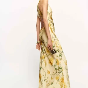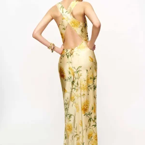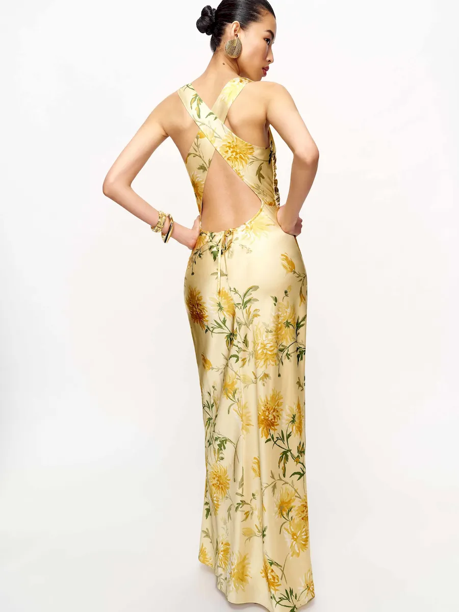 The model is wearing a size 0 and is 5’10”, 24.5″ waist, 34.5″ hips, 31″ bust.