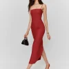 The model is wearing a size 0 and is 5’11”, 24″ waist, 35″ hips, 31″ bust.