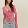 The model is wearing a size 0 and is 5′ 9.5″, 24″ waist, 34.5″ hips, 34″ bust.