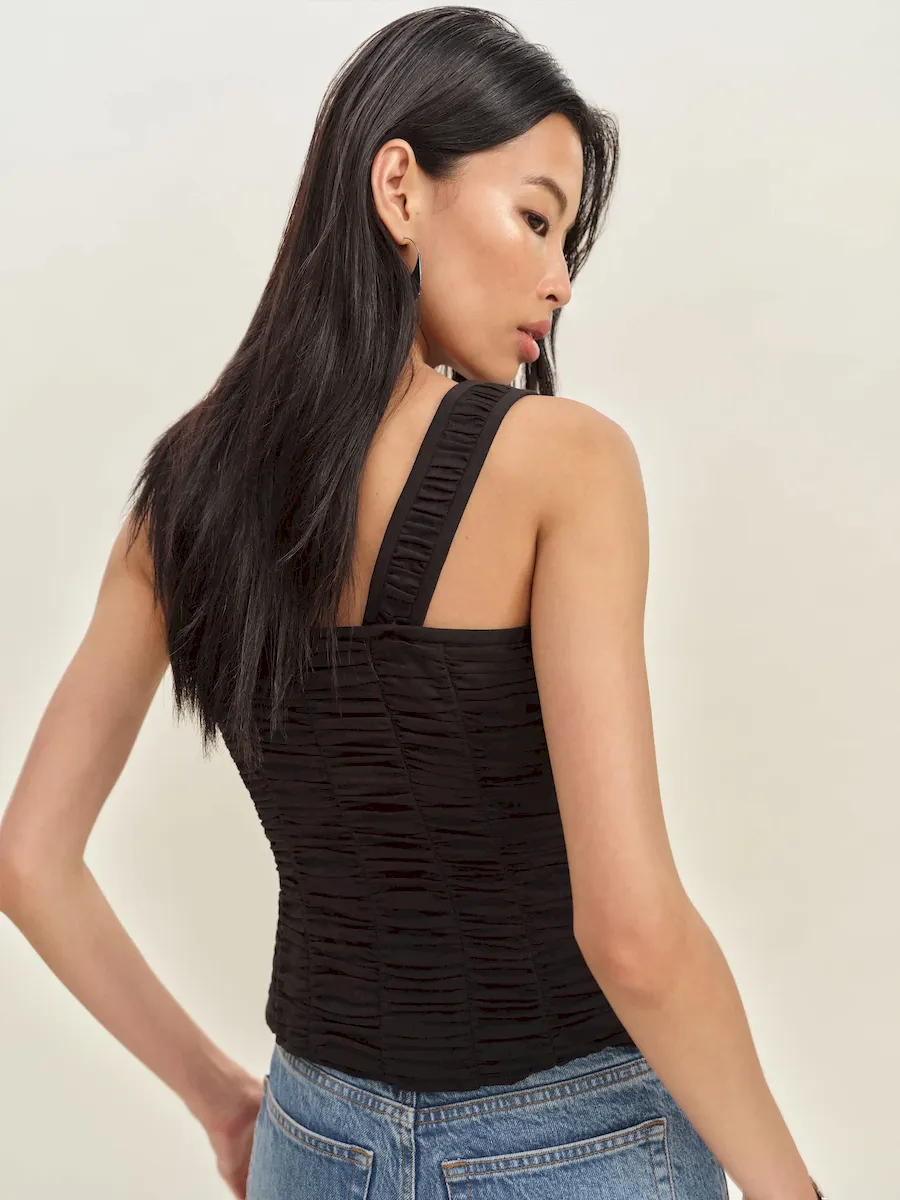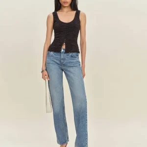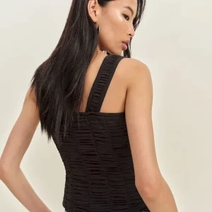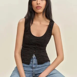 The model is wearing a size 0 and is 5’10”, 24.5″ waist, 34.5″ hips, 31″ bust.