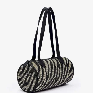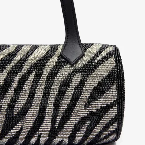 a cylindrical beaded shoulder bag with zipper closure.