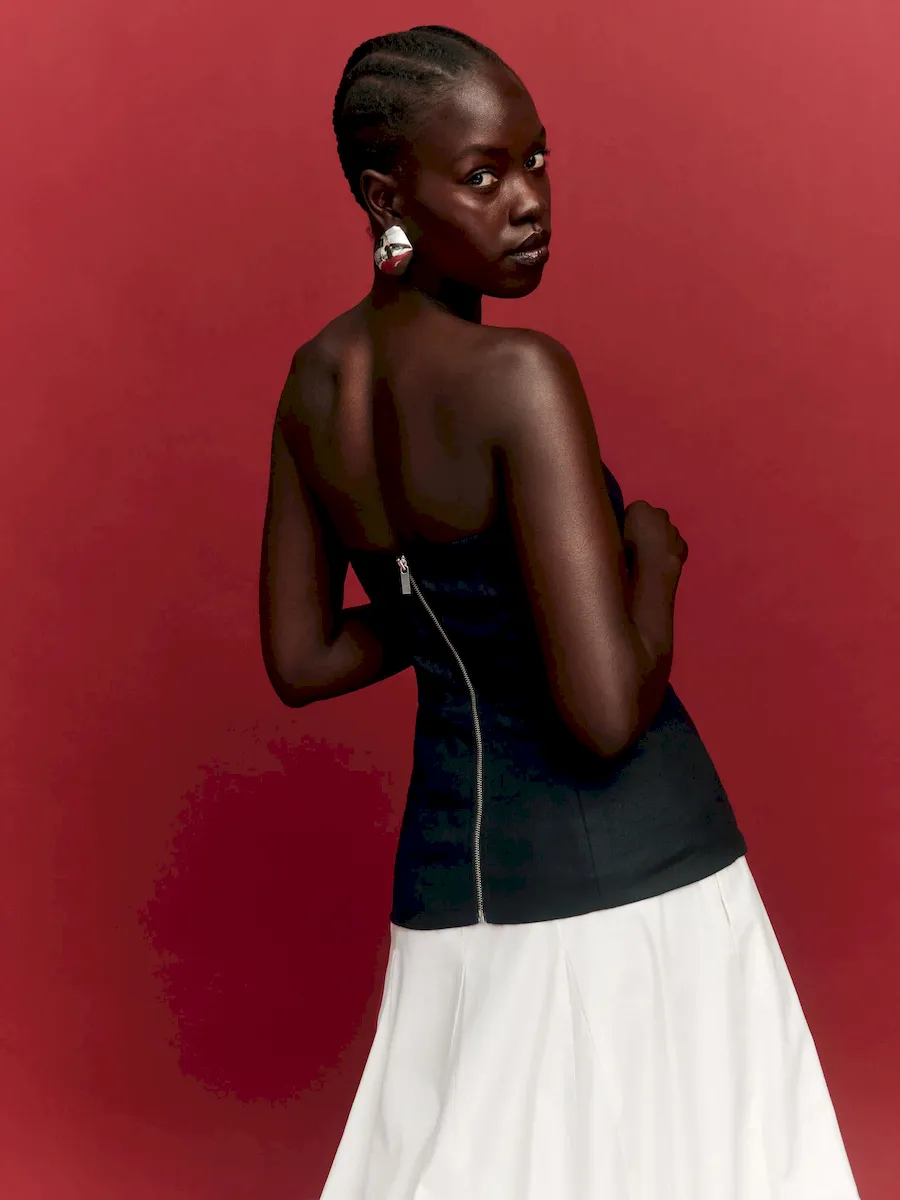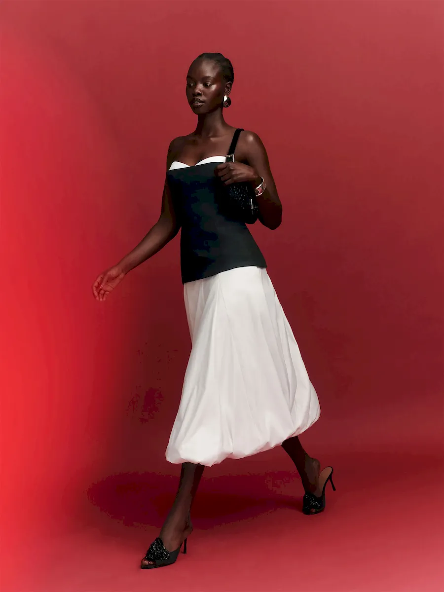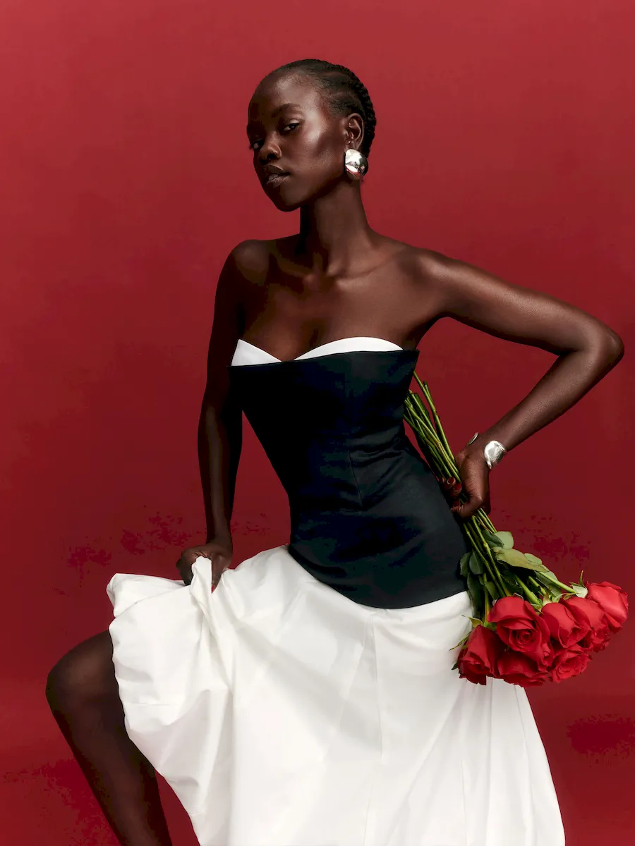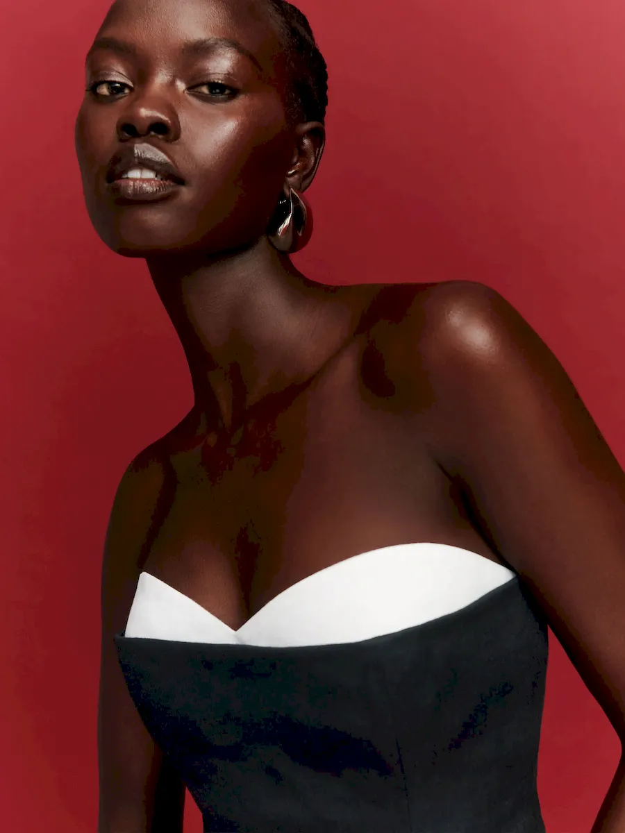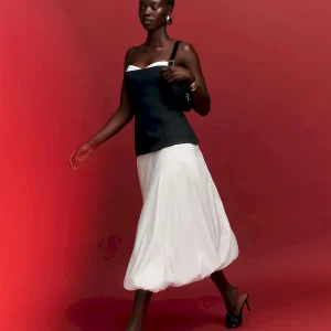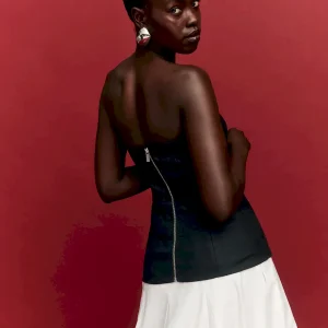 The model is wearing a size 4 and is 5’10”, 25.5″ waist, 35″ hips, 31.5″ bust.