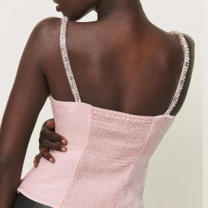 The model is wearing a size 0 and is 5’10”, 25″ waist, 35″ hips, 32″ bust.