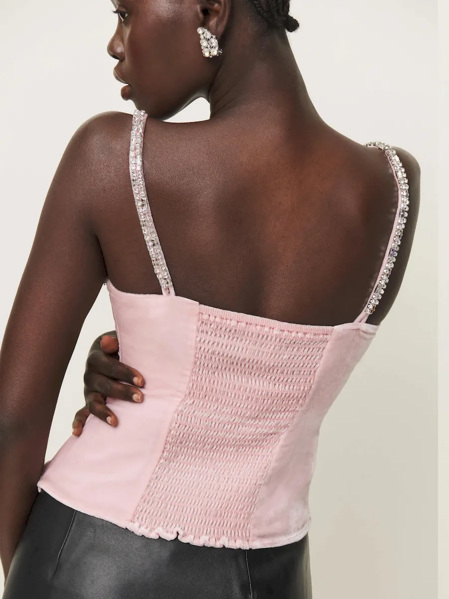 This is a soft, non-stretch velvet with a medium pile – 82% rayon, 18% silk Dry clean only. More onfabric & care.