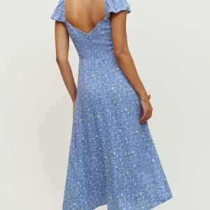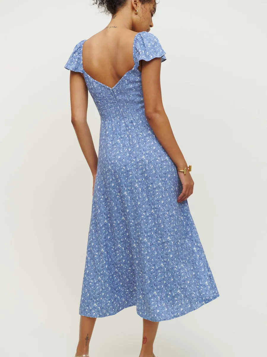 back smocking, non-adjustable straps, v-neck, front slit.