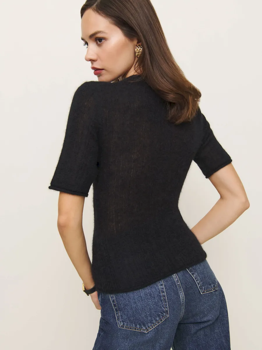 This is a tissue weight alpaca sweater yarn spun in Italy, made from 70% Baby Suri Alpaca, 21% Recycled Nylon, and 9% Nylon. Hand wash + dry flat. More onfabric & care.
