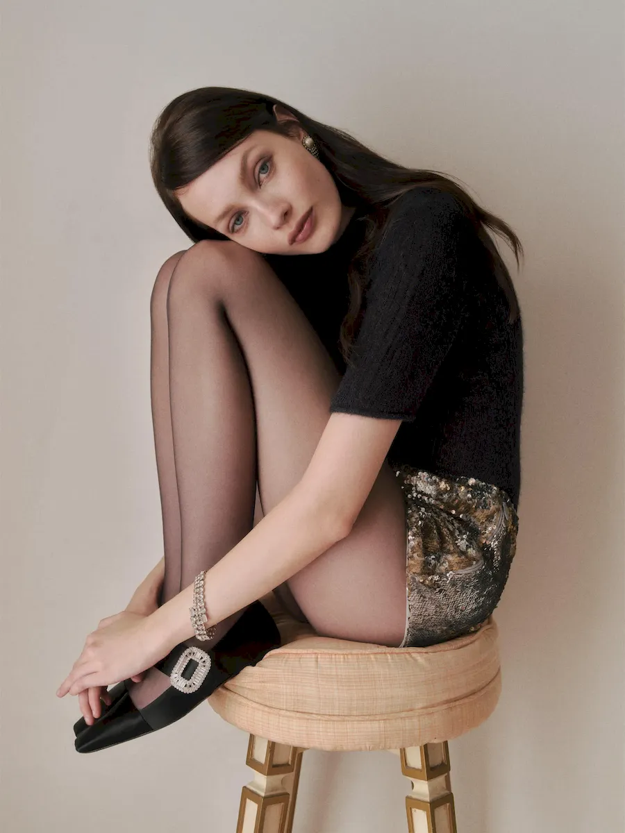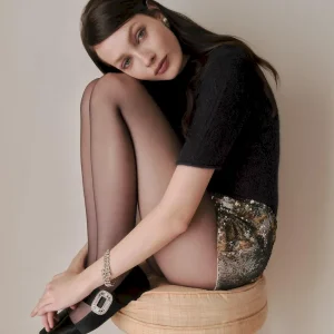 The model is wearing a size XS and is 5’9″, 24″ waist, 34″ hips, 32″ bust.