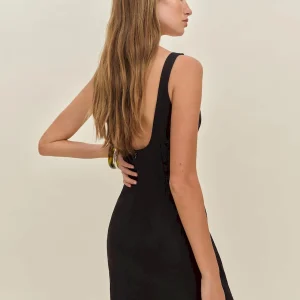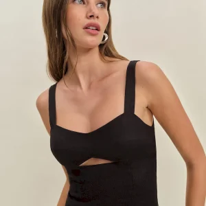The model is wearing a size 0 and is 5’9″, 23″ waist, 34″ hips, 32″ bust.