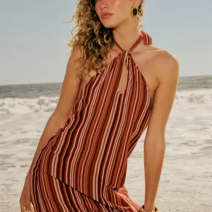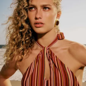 The model is wearing a size 2 and is 5’9″, 25″ waist, 36″ hips, 33.5″ bust.