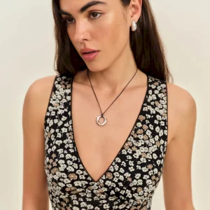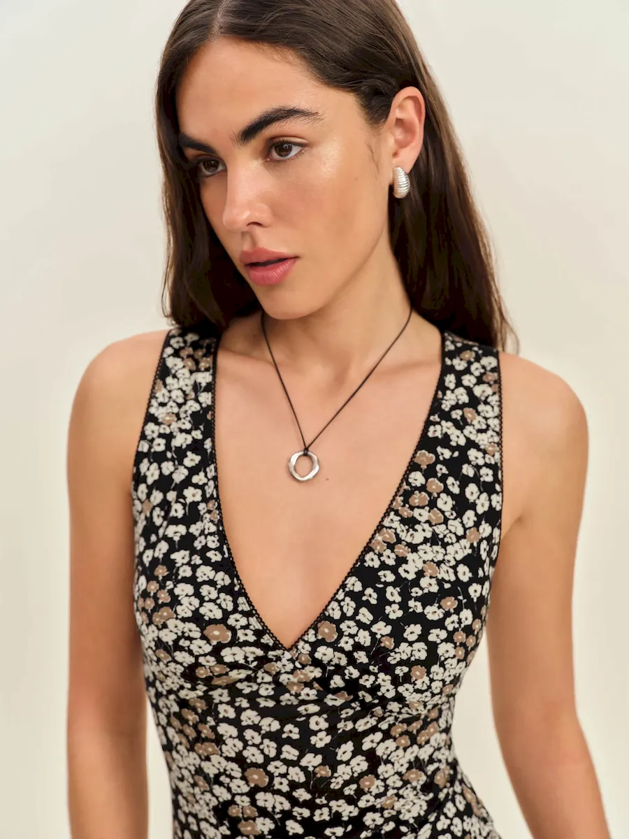 The model is wearing a size XS and is 5′ 9.5″, 24″ waist, 34.5″ hips, 34″ bust.