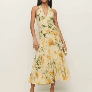 The model is wearing a size 4 and is 5’11”, 26″ waist, 38″ hips, 35″ bust.