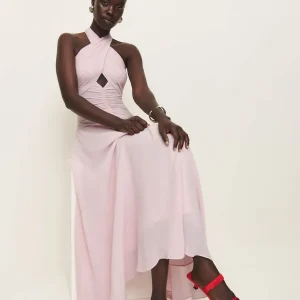 The model is wearing a size 0 and is 5’10”, 25″ waist, 35″ hips, 32″ bust.