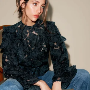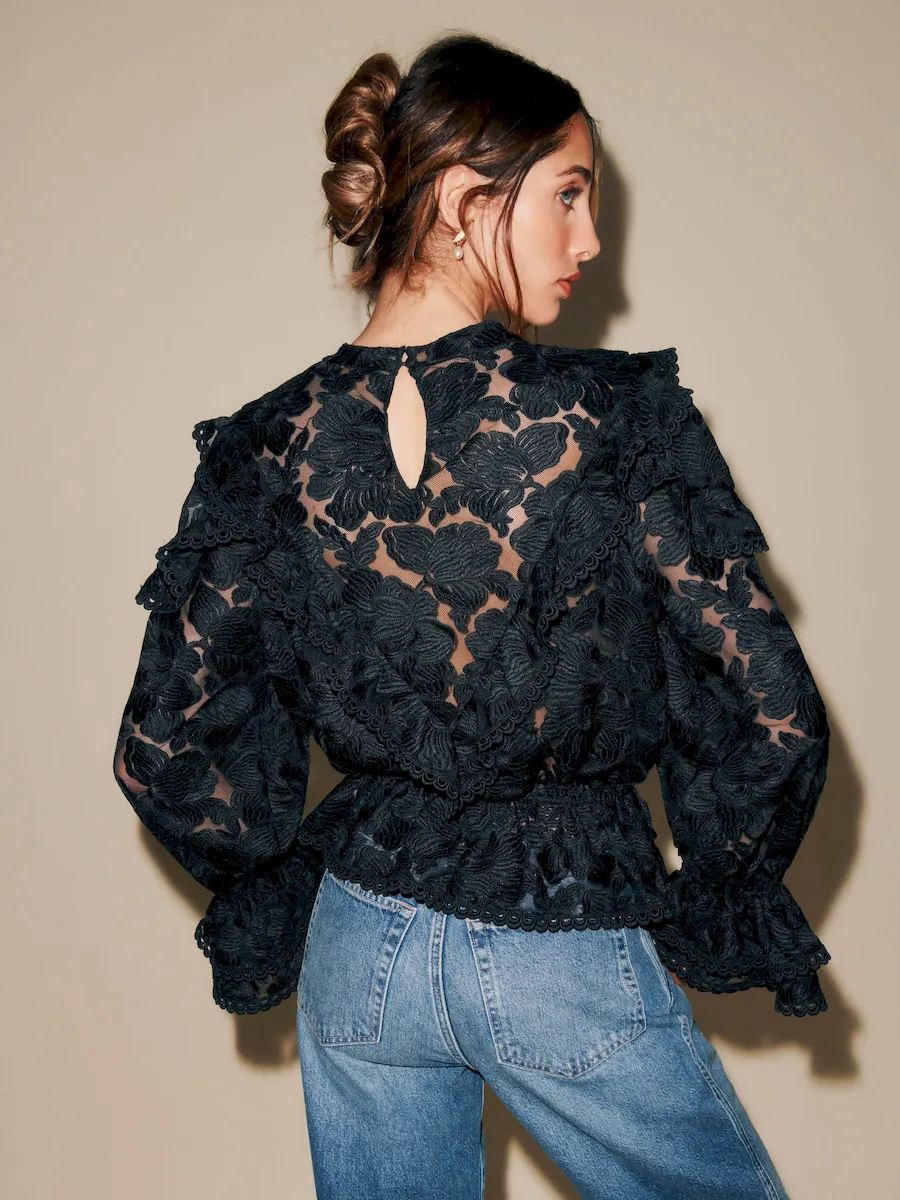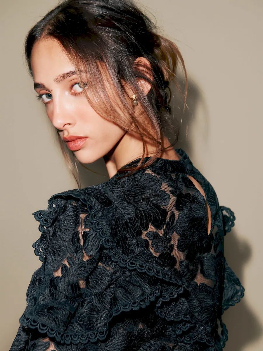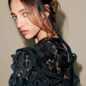 This is deadstock lace fabric features a high-coverage floral motif on a refined mesh base, made from 100% Polyester. Hand wash + dry flat. More onfabric & care.