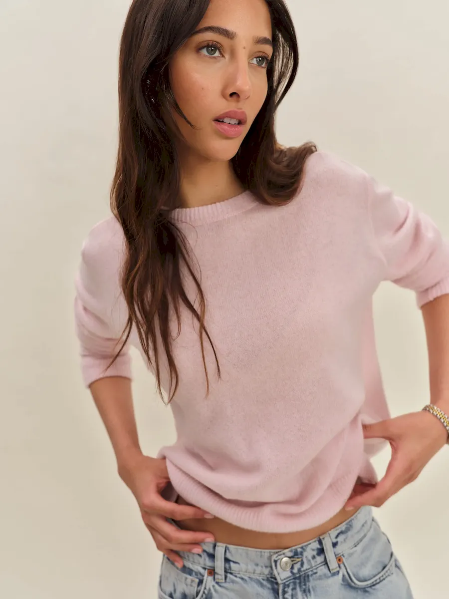This is a fine-gauge recycled cashmere blend sweater knit – 95% Recycled Cashmere, 5% Cashmere. Hand wash + dry flat. More onfabric & care.