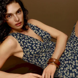 The model is wearing a size 2 and is 5’10”, 25″ waist, 36″ hips, 34″ bust.
