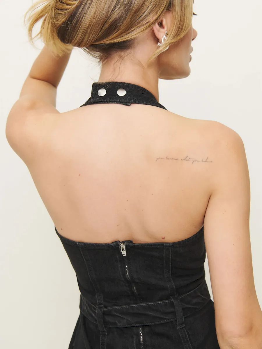 The model is wearing a size 0 and has a 24″ waist, 34.5″ hips.