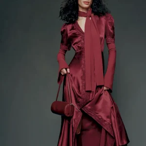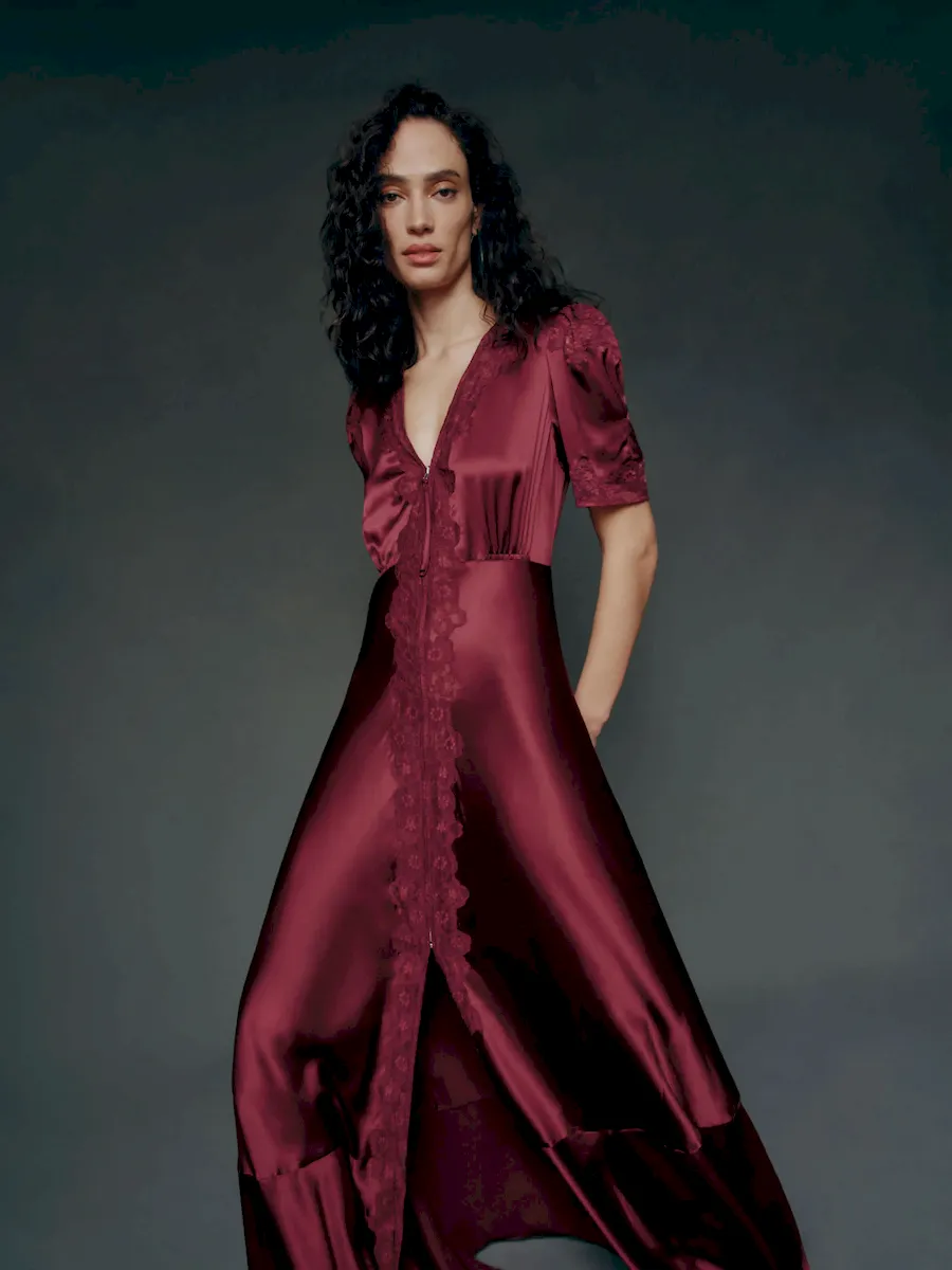 This is a lightweight silk charmeuse fabric – 100% silk. Dry clean only. More onfabric & care.