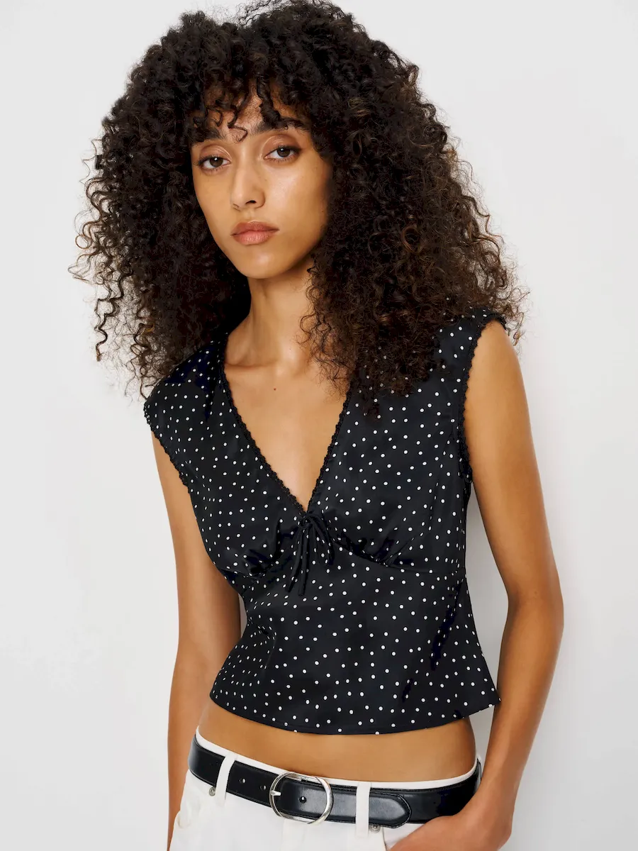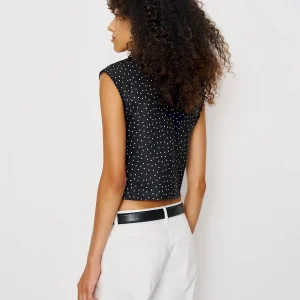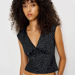The model is wearing a size 0 and is 5’10.5″, 23″ waist, 34.5″ hips, 31.5″ bust.
