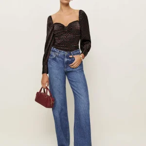 The model is wearing a size 0 and is 5’8″, 24″ waist, 36″ hips, 32″ bust.