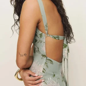 The model is wearing a size 0 and is 5’10”, 23″ waist, 34″ hips, 32″ bust.