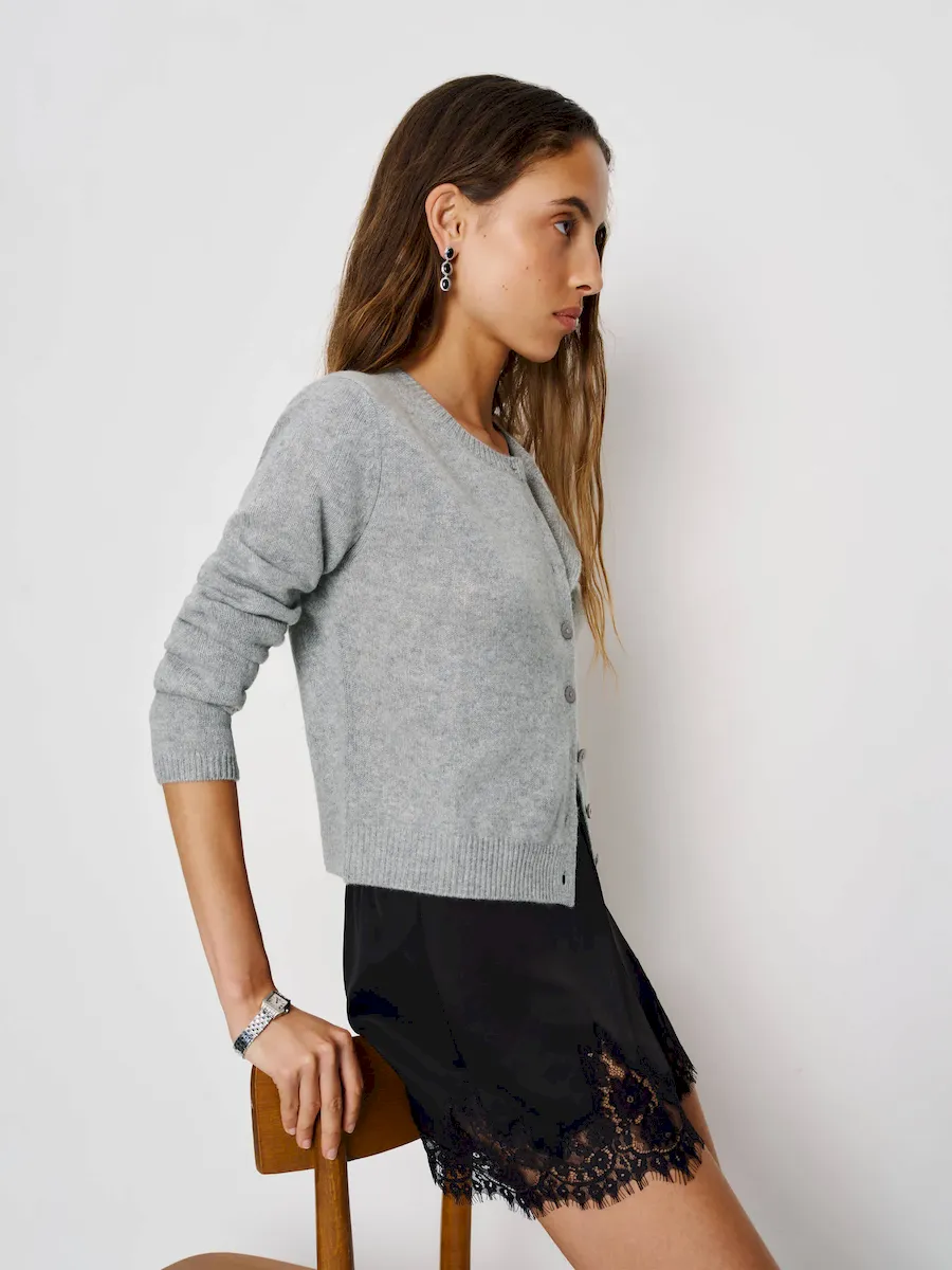 This is a fine-gauge recycled cashmere blend sweater knit – 95% Recycled Cashmere, 5% Cashmere.