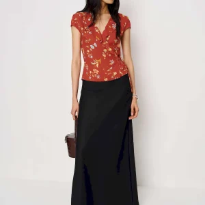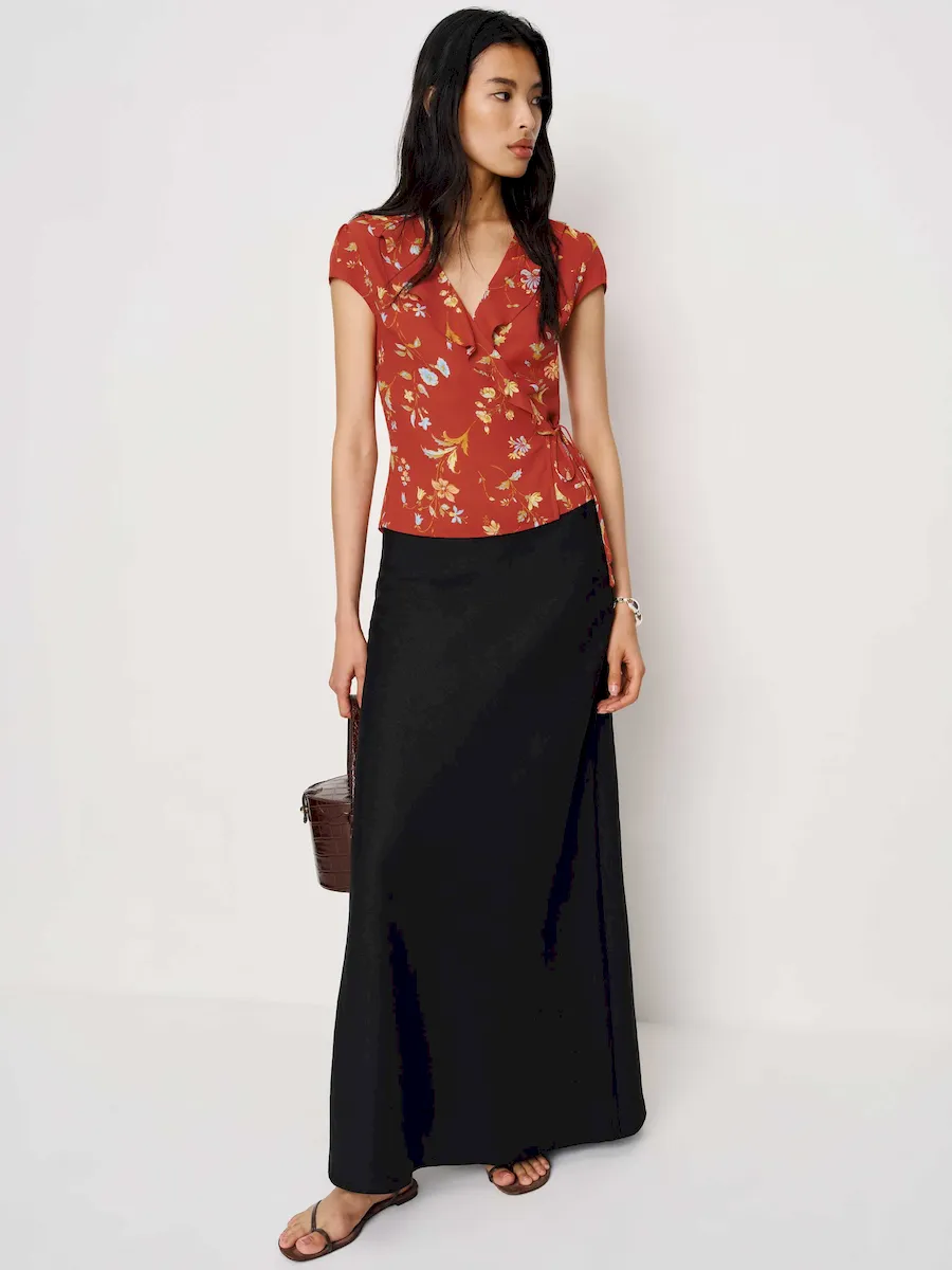 The model is wearing a size 0 and is 5’10”, 24.5″ waist, 34.5″ hips, 31″ bust.