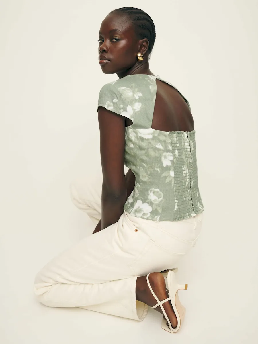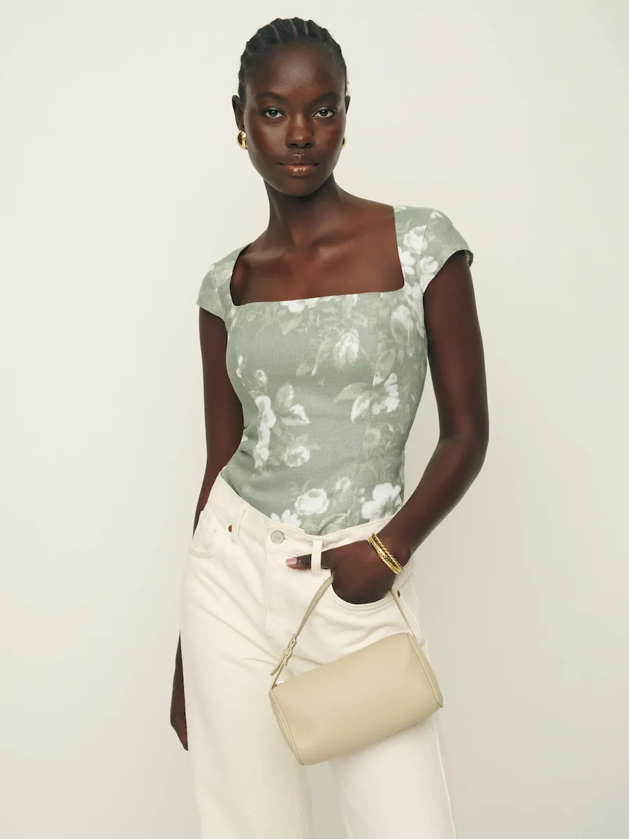 The model is wearing a size 0 and is 5’10”, 25″ waist, 35″ hips, 32″ bust.