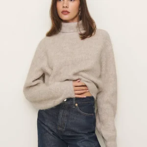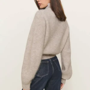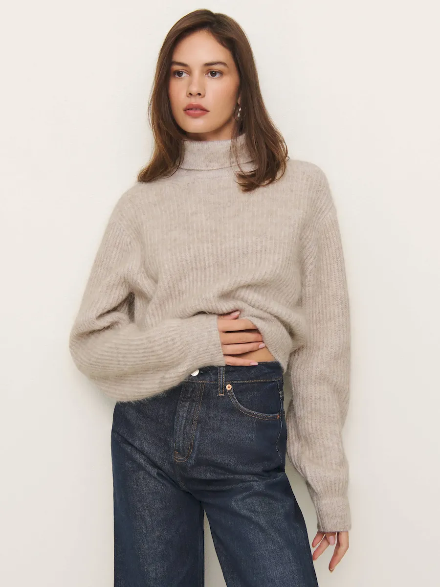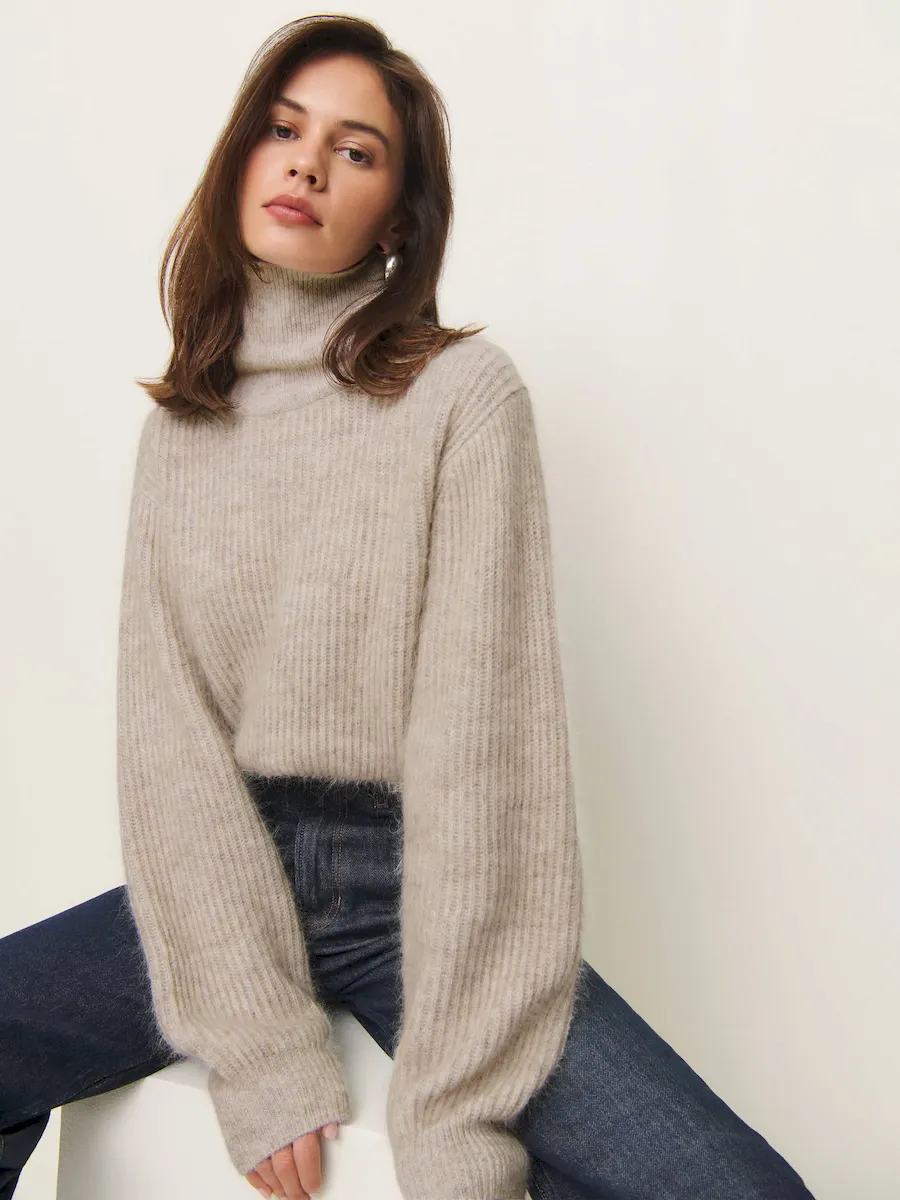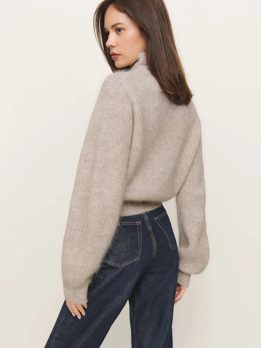 This sweater is knitted using our fine gauge merino wool and tissue weight alpaca yarns- blended fiber content is 47% traceable NATIVA™️ wool sourced from a transitional regenerative farm, 37% Baby Suri Alpaca, and 16% Nylon Dry clean only. More onfabric & care.