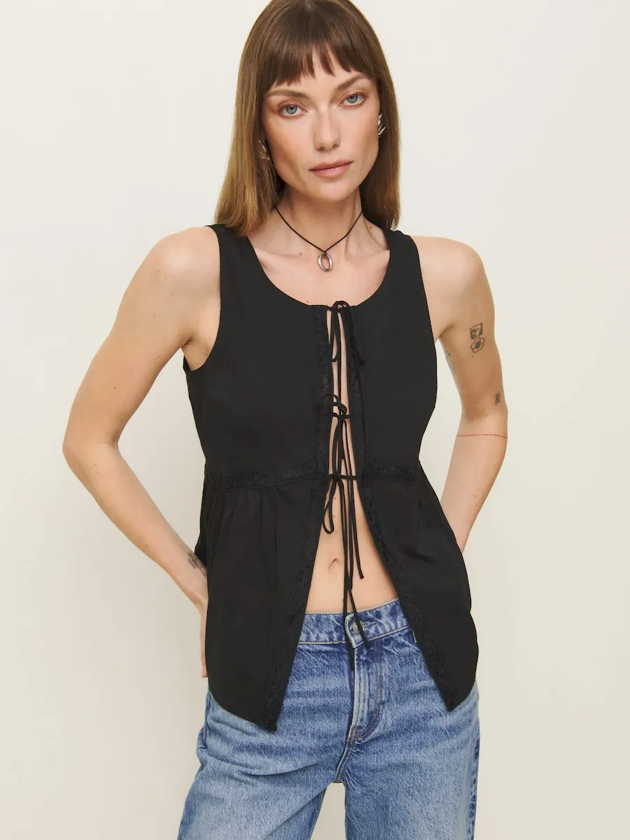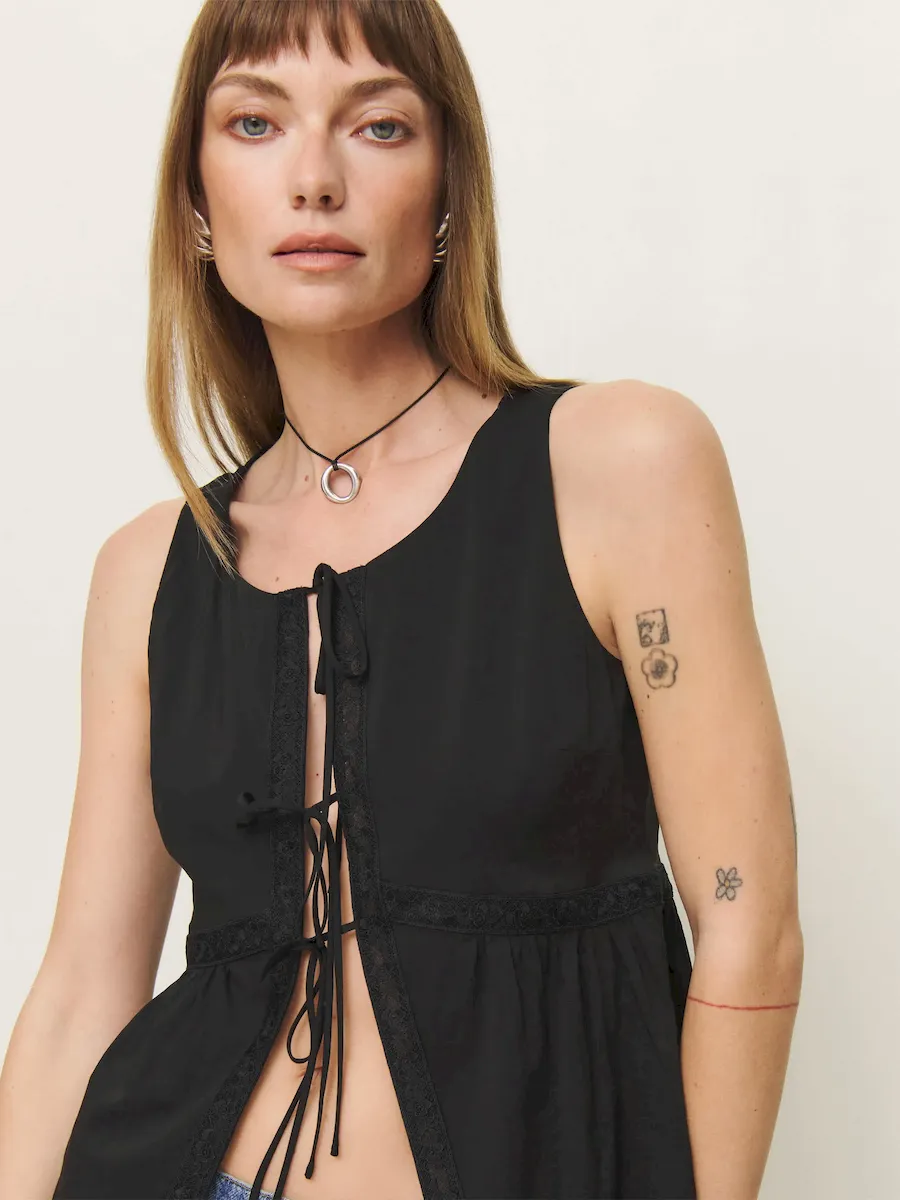 The model is wearing a size XS and is 5’10”, 25″ waist, 34.5″ hips, 31″ bust.