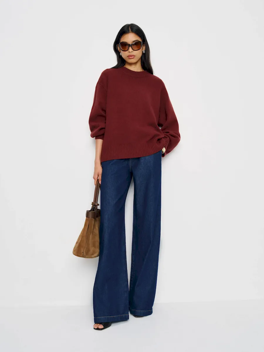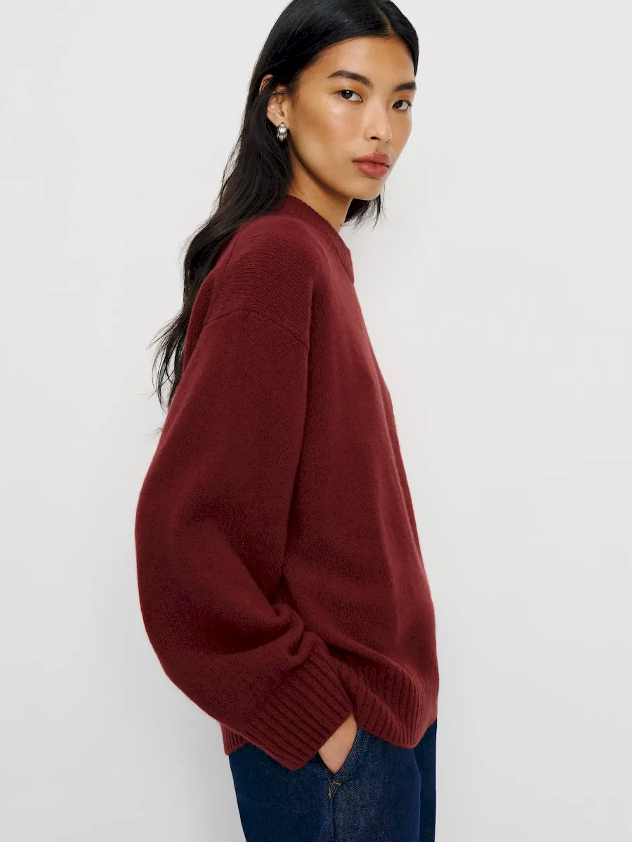 Nothing new here except this yarn made with all recycled materials. Mostly recycled cashmere, but also some recycled wool, and zero new, virgin fibers. Our new most recycled blend ever, same commitment to carbon reduction and circularity. This is a medium-weight recycled cashmere blend sweater knit from 95% Recycled Cashmere, 5% Recycled Wool. Soft as cashmere but now 100% recycled. Hand wash + dry flat. More onfabric & care.