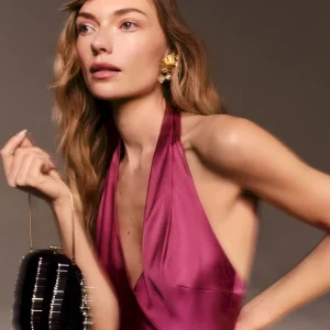 The model is wearing a size 0 and is 5’10”, 25″ waist, 34.5″ hips, 31″ bust.