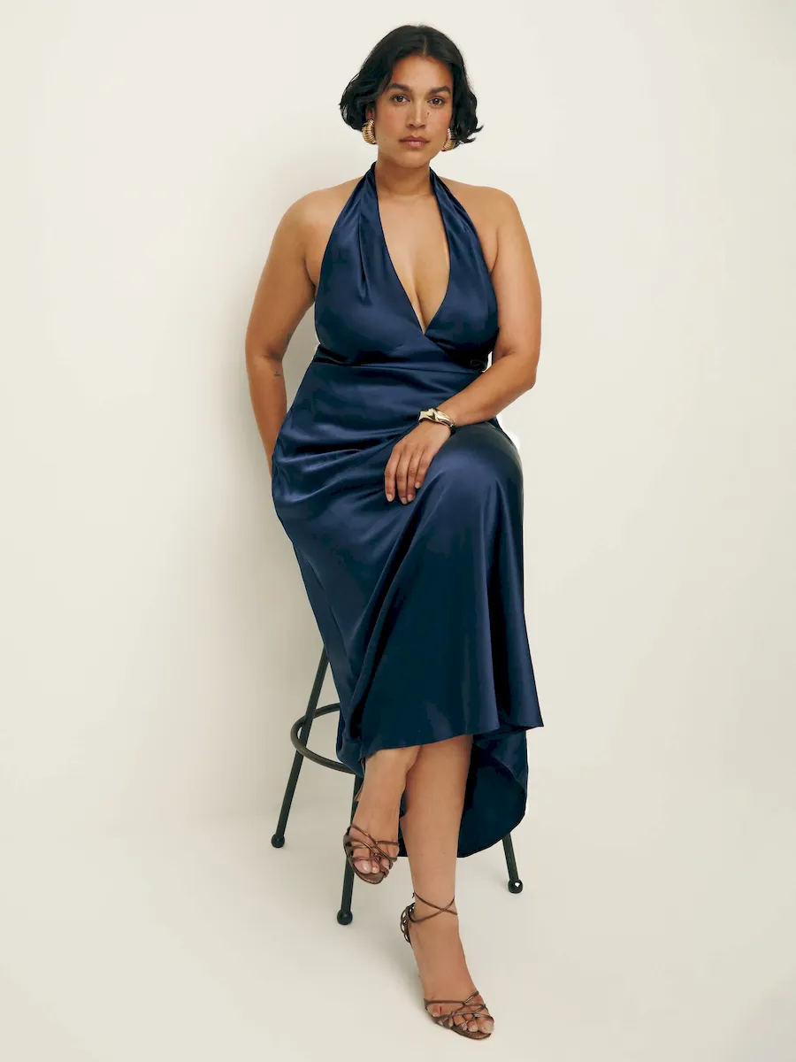 The model is wearing a size 0 and is 5’10”, 23.5″ waist, 34.5″ hips, 31.5″ bust.
