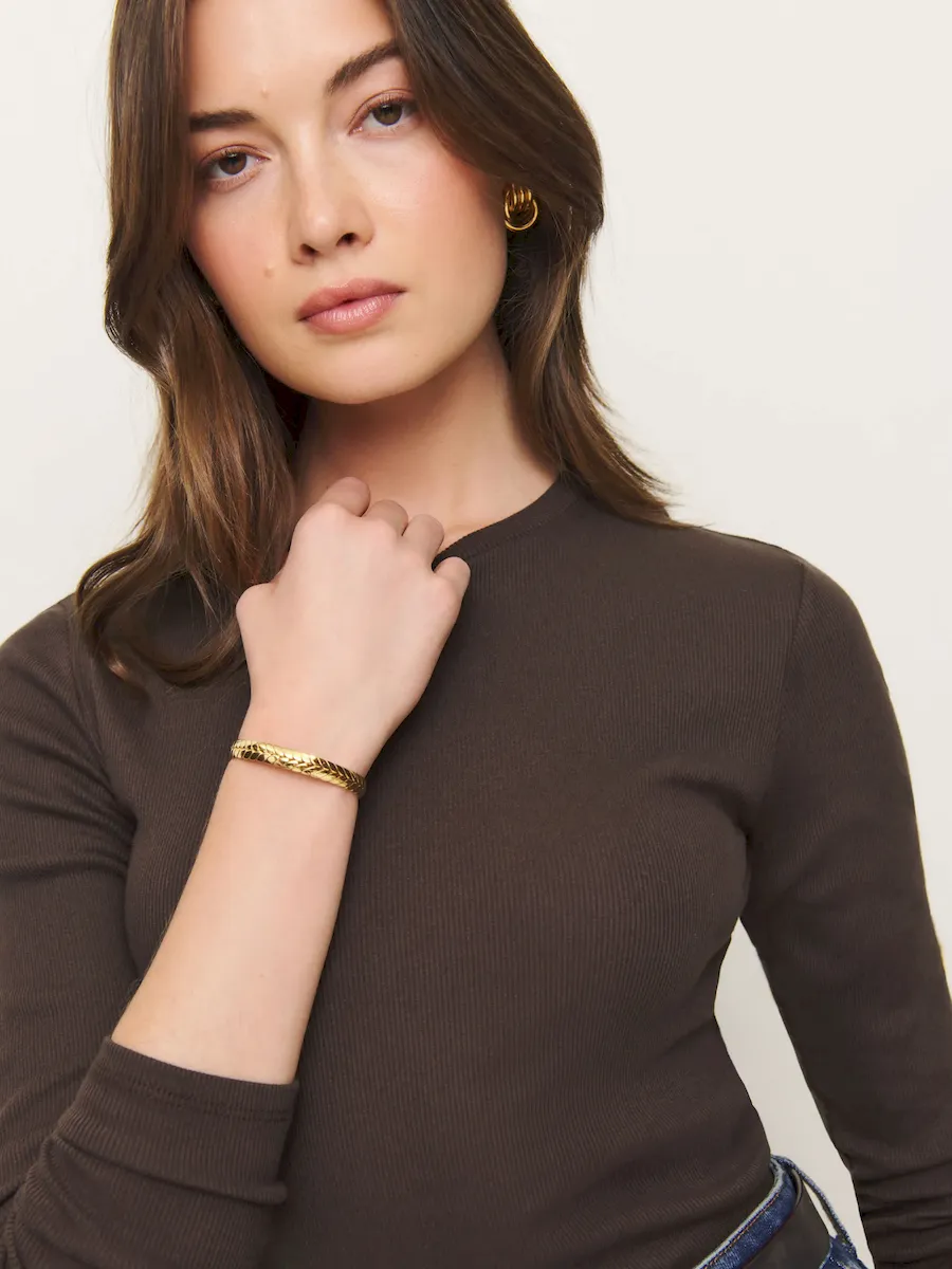 This is a 2×1 medium weight rib knit fabric with moderate stretch made from 97% Organically Grown Cotton and 3% Spandex. Hand wash + dry flat. More onfabric & care.