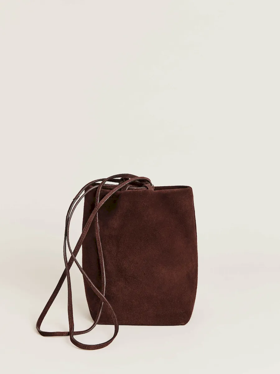 a pouch bag with an adjustable drawstring strap.