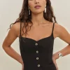 The model is wearing a size 0 and is 5’7″, 23″ waist, 34″ hips, 32″ bust.