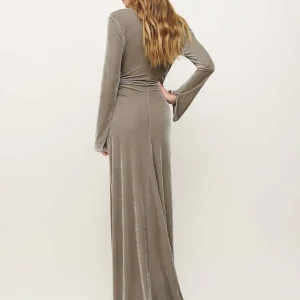The model is wearing a size 0 and is 5’10”, 25″ waist, 34.5″ hips, 31″ bust.