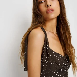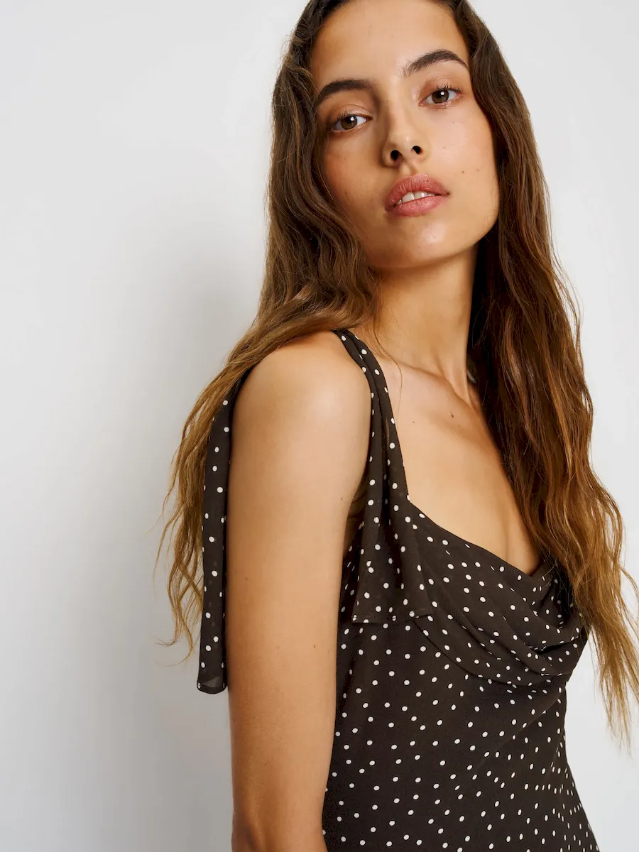 The model is wearing a size 0 and is 5’9″, 24″ waist, 34″ hips, 30″ bust.