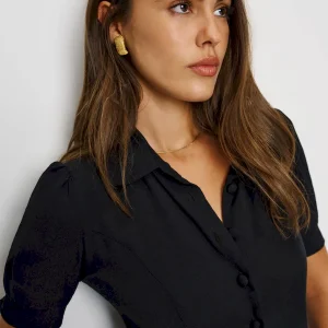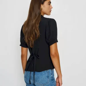 The model is wearing a size 0 and is 5′ 9.5″, 24″ waist, 34.5″ hips, 34″ bust.