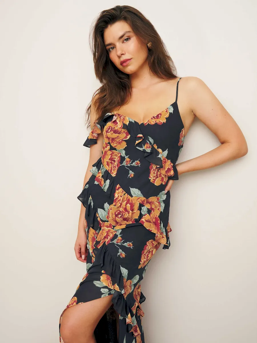 The model is wearing a size 6 and is 5’9″, 27″ waist, 38″ hips, 32″ bust.