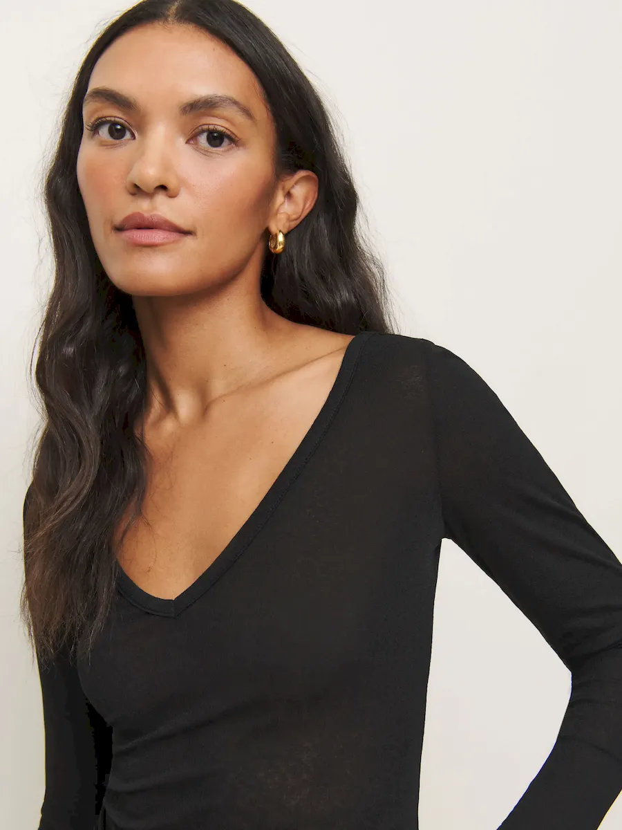 The model is wearing a size XS and is 5’11”, 24″ waist, 34″ hips, 32″ bust.