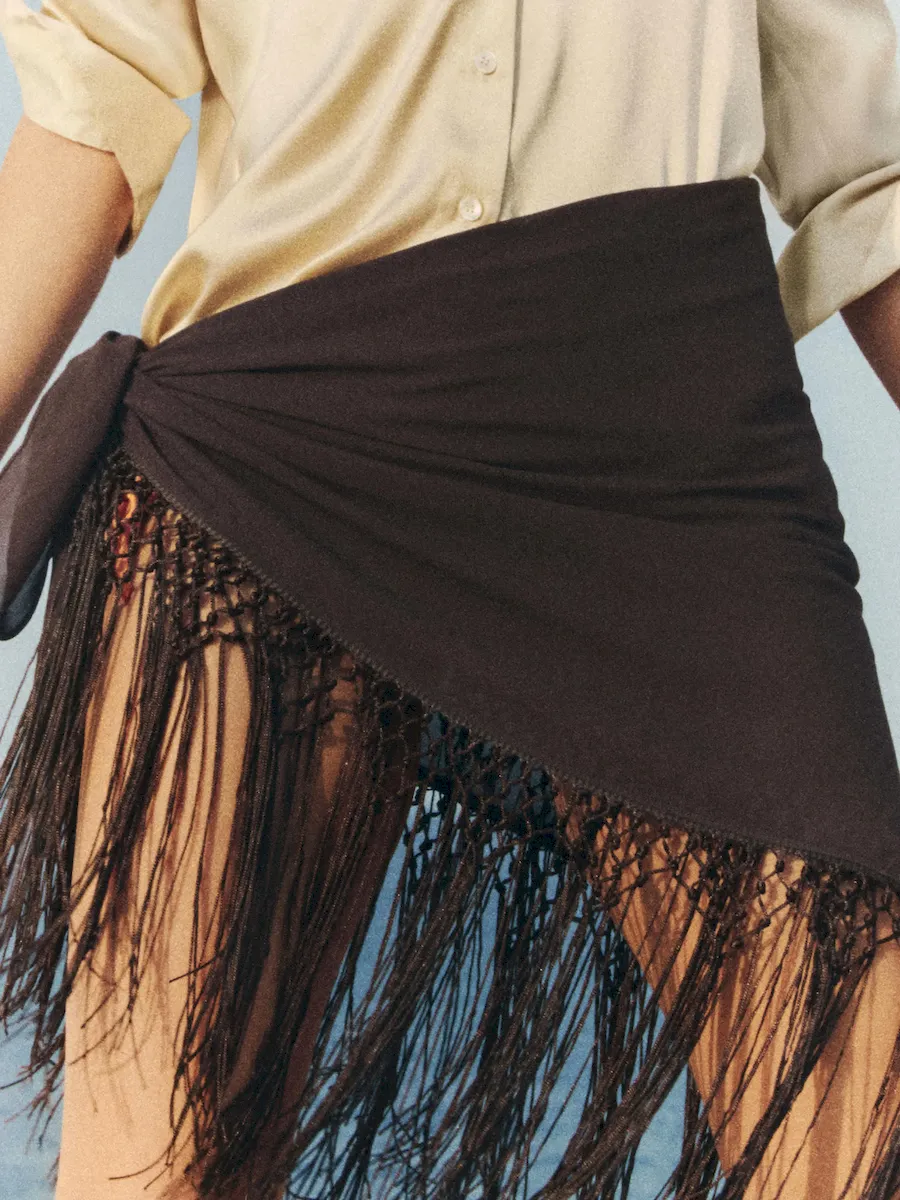 The model is wearing a size XS and has a 24″ waist, 35″ hips.