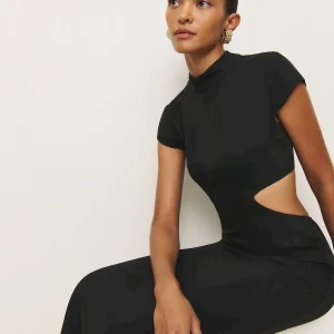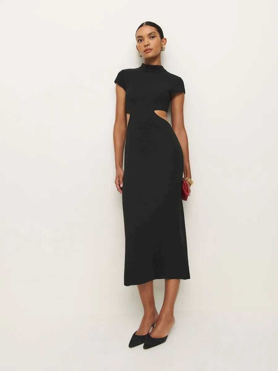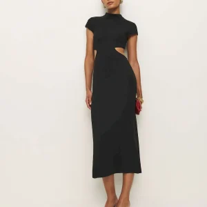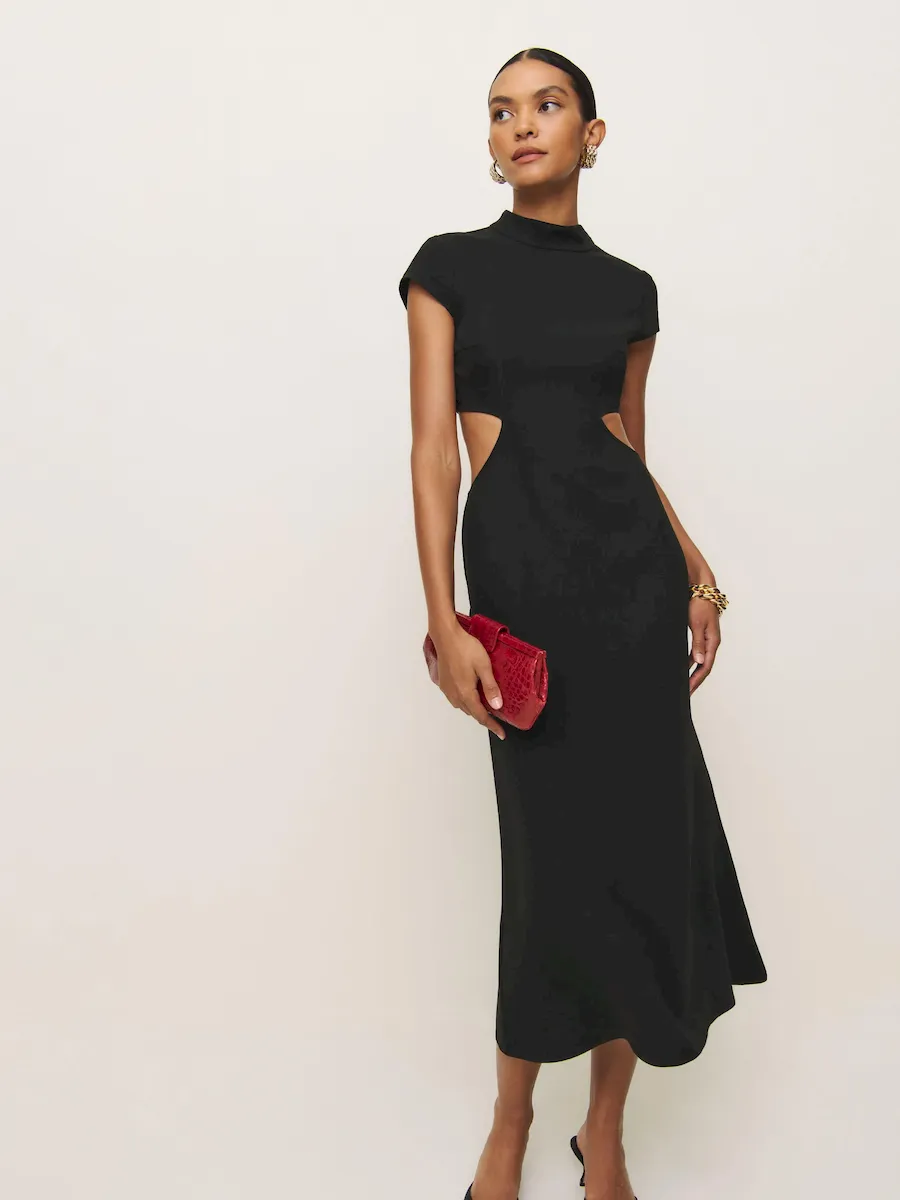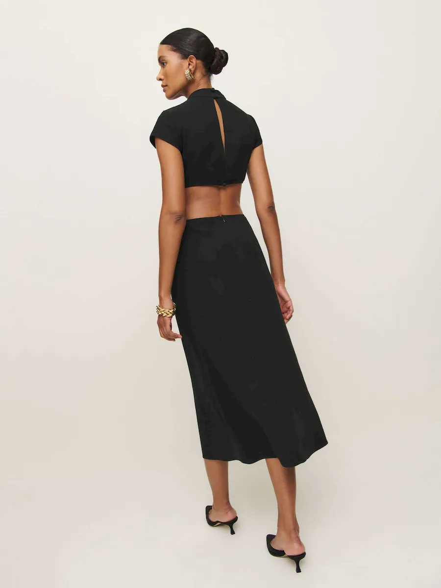 The model is wearing a size 0 and is 5’11”, 24″ waist, 34″ hips, 32″ bust.