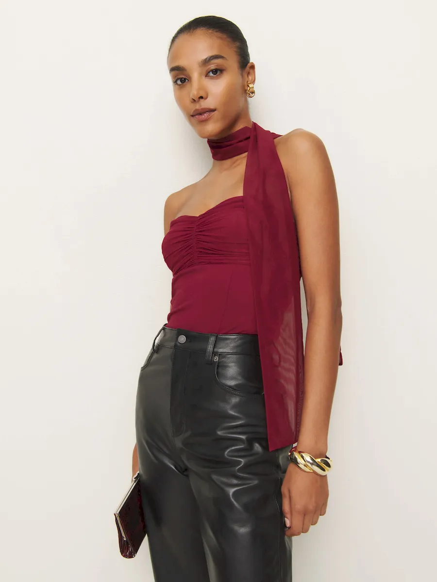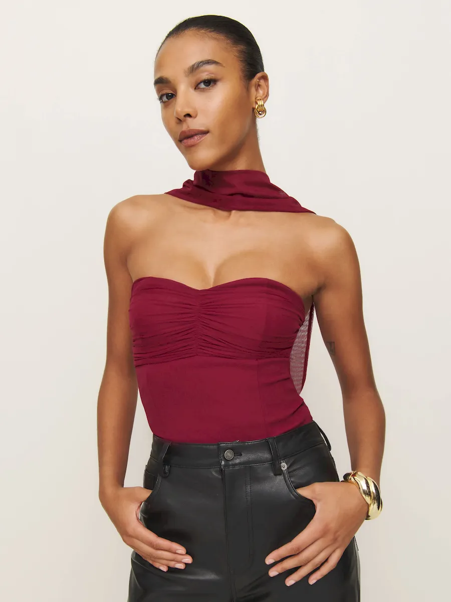 The model is wearing a size S and is 5’11”, 26″ waist, 38″ hips, 35″ bust.