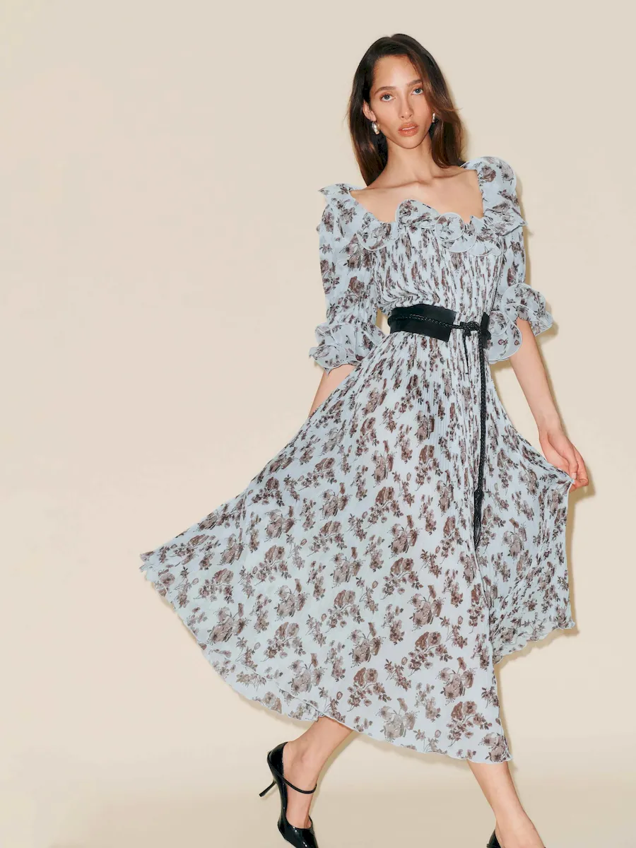 The model is wearing a size 2 and is 5’10”, 23″ waist, 34″ hips, 31″ bust.